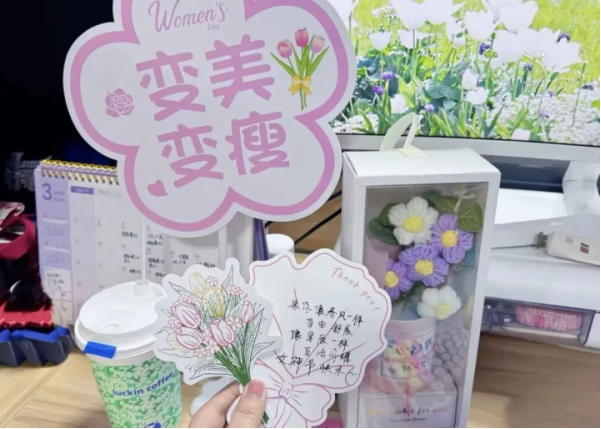 瑞幸咖啡的取餐台变身能量补给站,老师们拿着定制的专属姓名贴,领取的限定咖啡暖手更暖心!而各部门负责人为女职工们亲手送上伴手礼+手写贺卡,字里行间流露出真挚的情感与温暖的关怀。还有海立方娱乐城