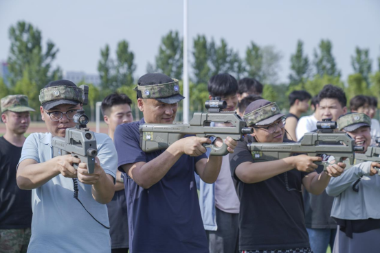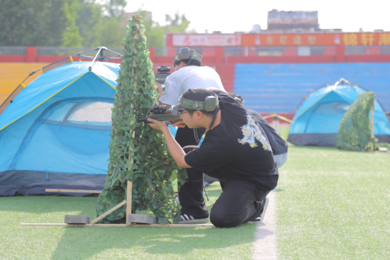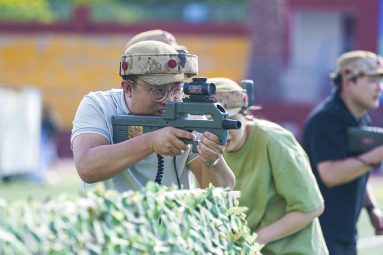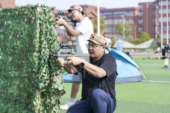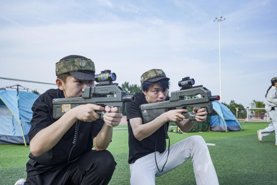 校园里,激光真人对抗激战正酣。同学们手持装备,行动有序,在对抗场地中穿梭、隐蔽、举枪瞄准、果断射击。每个人都全身心地投入其中。他们眼神专注,动作敏捷,紧张认真地讨论作战策略,灵活冷静地应对变化局势,投入的模样尽显青春活力。