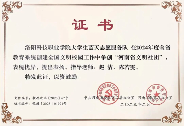 大学生蓝天志愿服务队荣获“2023年度河南省蓝天救援团队发展建设奖”,队员伊志龙、李志远获“优秀志愿者”称号;2024年,该队再获“河南省文明社团”表彰,受到省委教育工委、省教育厅的表扬。
