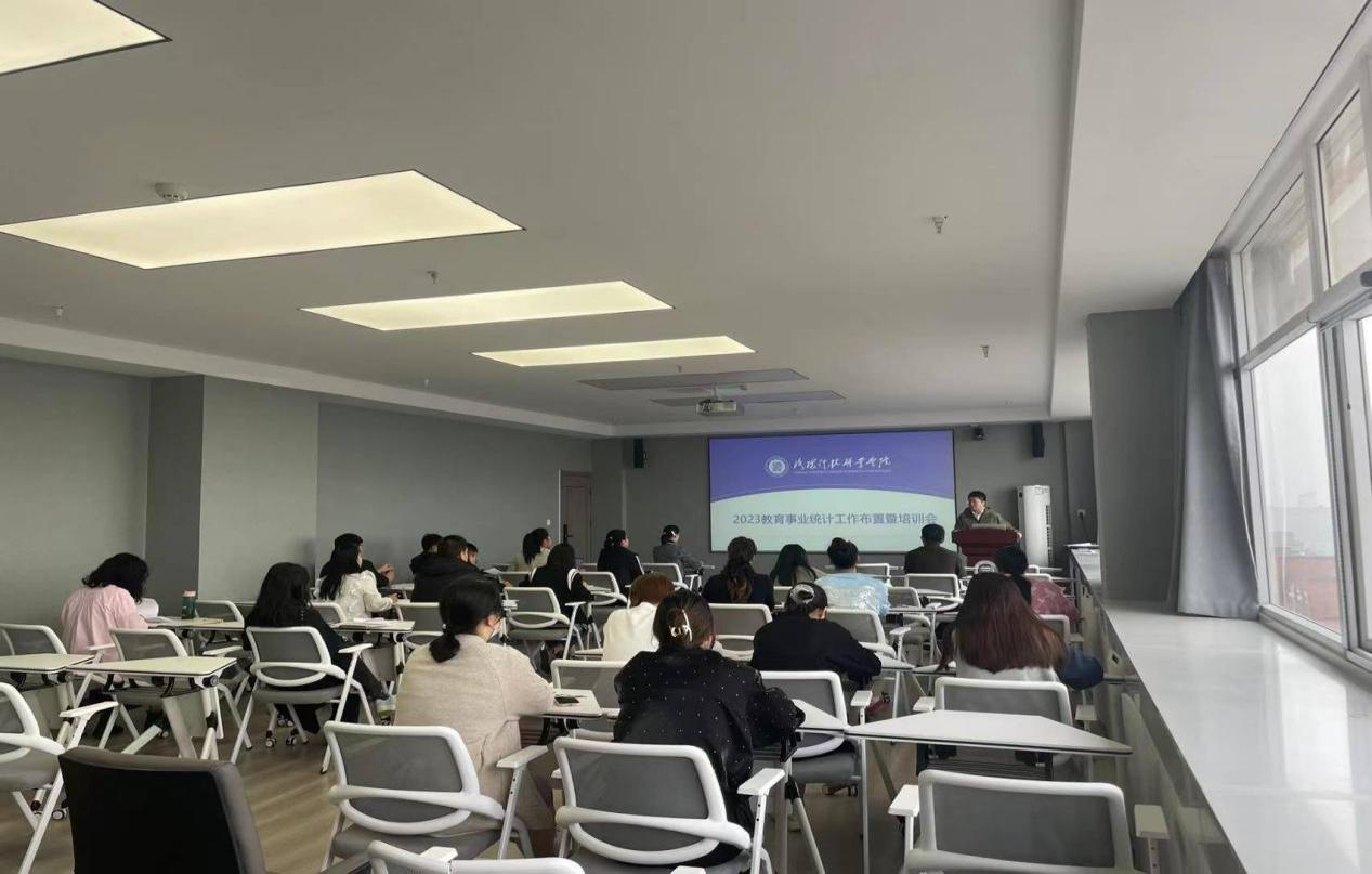 在至善大厦9楼格物厅召开2023年河南省教育事业统计部署暨培训会,会议由副校长牛耀堂主持,各相关部门负责人及数据填报人员参与会议。