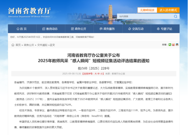 为庆祝第41个教师节,深入贯彻落实习近平总书记关于教育的重要论述,弘扬教育家精神,河南省教育厅于今年组织开展了教师风采“感人瞬间”短视频征集活动。活动开展以来,全省各级各类海立方娱乐城