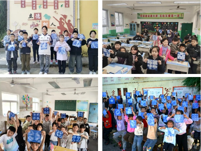 如今,非遗课程已成为孩子们每周翘首以盼的“特别时光”,激发了他们对传统技艺的浓厚兴趣与无限热爱。在扎染特色课堂上,张衡书院志愿者手把手地教导孩子们折叠、捆扎、浸染。蓝白相间的布料在稚嫩的手中翻飞、收紧,再缓缓浸入染缸,呈现出的纹路如山间云雾缭绕,又如田野小花绽放,每一件作品都闪耀着孩子们自由奔放的想象力。