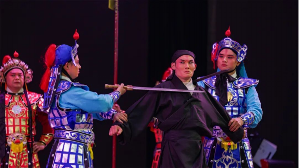 当日下午,大礼堂内座无虚席,红色幕布缓缓拉开,《穆桂英挂帅》率先登场。“我不挂帅谁挂帅,我不领兵谁领兵”,当穆桂英身着戎装、手持令旗亮相时,其英姿飒爽的神态、铿锵有力的唱词瞬间点燃全场气氛。演员们通过细腻的身段表演展现穆桂英从犹豫到坚定的心理转变,用跌宕起伏的唱腔传递“家国为重、舍身报国”的赤子情怀。台下同学们屏息凝神,时而为穆桂英的抉择揪心,时而为杨家将的忠勇鼓掌,传统文化中蕴含的精神力量跨越时空,直抵人心。