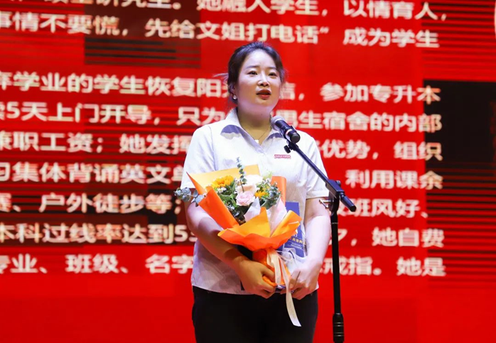 周文文,女,31岁,中共党员,硕士研究生。她融入学生,以情育人,以饱满的热情投入工作,“遇到事情不要慌,先给文姐打电话”成为学生们的口头禅。她帮助一名因抑郁症准备放弃学业的学生恢复阳光自信,参加专升本学习成功被本科院校录取;她连续5天上门开导,只为化解男生宿舍的内部矛盾;她帮助学生追回被拖欠的兼职工资;她发挥自己的性格优势,组织学生积极开展各类活动,在晚自习集体背诵英文单词和古诗词,利用课余时间开展篮球比赛、两人三足比赛、户外徒步等;她带领的班级班风好、学风浓,在2021年专升本考试中本科过线率达到53%;毕业前夕,她自费千余元,给每个学生定制了刻有专业、班级、名字的专属纪念戒指。她是学生们心中的“文姐”。