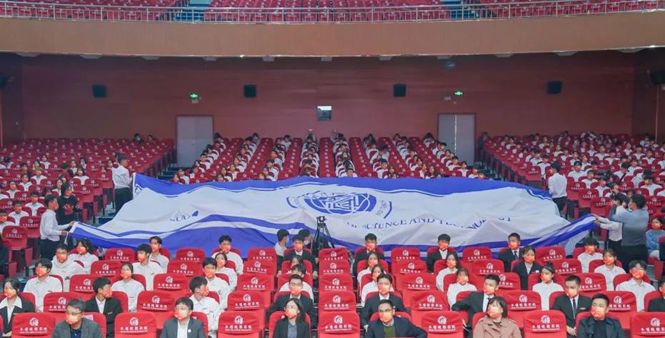 伴随着悠扬的音乐,巨幅校旗从新生代表的头顶缓缓飘过,大家纷纷举起双手,托起校旗,由前向后传递,仪式感瞬间拉满!