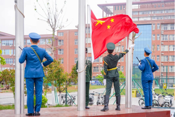 国旗护卫队的队员们迈着坚定有力的步伐,眼神坚毅,身姿笔挺,以昂扬的姿态将国旗护送至升旗台。伴随着雄壮的国歌声,鲜艳的五星红旗冉冉升起。