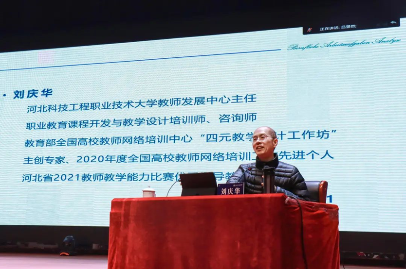 来自河北科技工程职业技术大学的刘庆华教授为全体教师做了首场讲座—“基于OBE理念的职业教育人才培养方案开发要点”。刘庆华深入分析OBE理念的内涵,从如何做好学生有效培养引出“培养什么人”“怎么培养人”,细致解读专业人才培养的“顶层设计”专业课程体系及其核心内容,并重点分析了服务专业人才培养方案开发的先进系统方法—典型工作任务分析法(BAG法)。他结合具体案例,引导教师思考所在专业目前课程体系及开发思路。明确当前OBE理念推行过程中,人才培养方案优化及教学改革“落地难”的问题及解决方法。