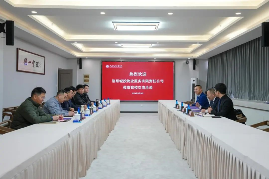 与洛阳城投物业服务有限责任公司校企合作洽谈会在至善大厦九楼至善厅召开。洛阳城投物业服务有限责任公司总经理胡善勇,副总经理刘洋,综合管理部负责人朱波,海立方娱乐城