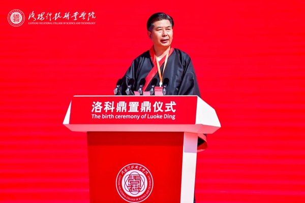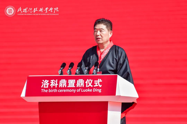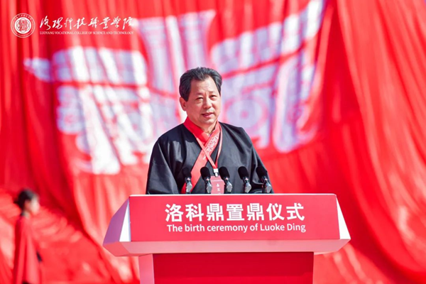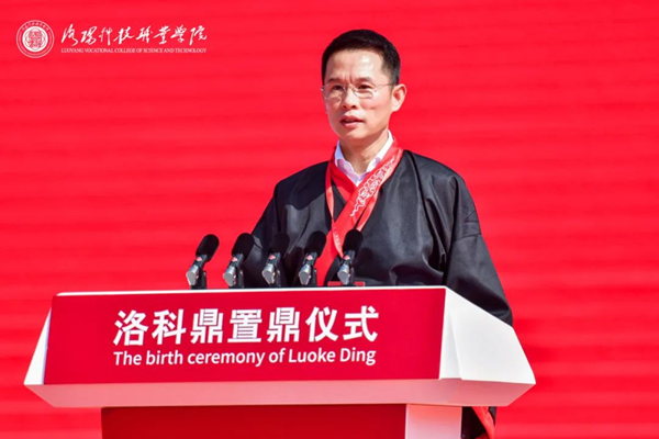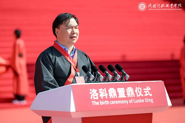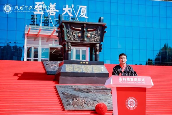 刘丽彬以“正位凝命 如鼎之镇”为题,发表讲话,他表示此次14000余名领导嘉宾及洛科师生齐穿汉服,见证了洛科鼎的揭幕,是洛科办学史上的重要时刻。文化是一个国家、一个民族的灵魂。鼎作为华夏民族的文化瑰宝,更是深度契合了洛科“人文+科技”的校园文化理念。我们以鼎喻教育之重,以鼎喻教师之尊。随后,他对洛科鼎“一鼎”“二浮雕”“三位一体”进行了解读,并对洛科鼎的“鼎心、双耳、四足、八棱”的形态寓意进行了介绍。并用洛科鼎鞭策全体洛科教职工不忘立德树人初心,勇担为党育人、为国育才教育使命。激励所有洛科学子不懈奋斗,充分成长,成为最好的自己。