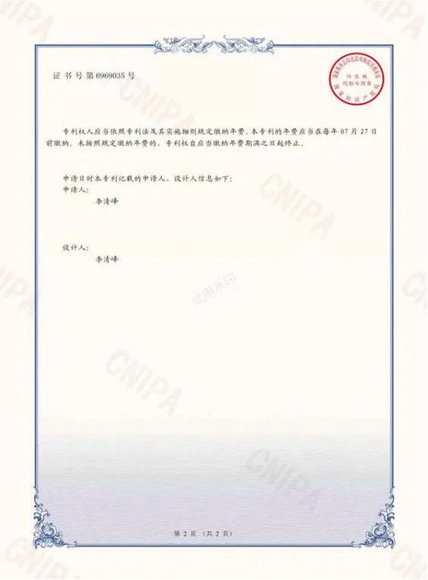 2021年5月,数控实训设计结束后,李清峰并没有停下脚步。他深知,要想在数控领域走得更远,必须不断提高自己的专业技能。于是,他开始专注于解决实训过程中遇到的技术问题,并向专业的老师和工程师请教。经过几个月的努力,终于在2021年10月,他成功地完善并获得了自己人生中的第一个设计专利。这一刻,内心的喜悦和成就感是无法用语言来形容的。