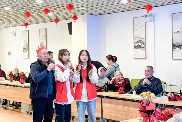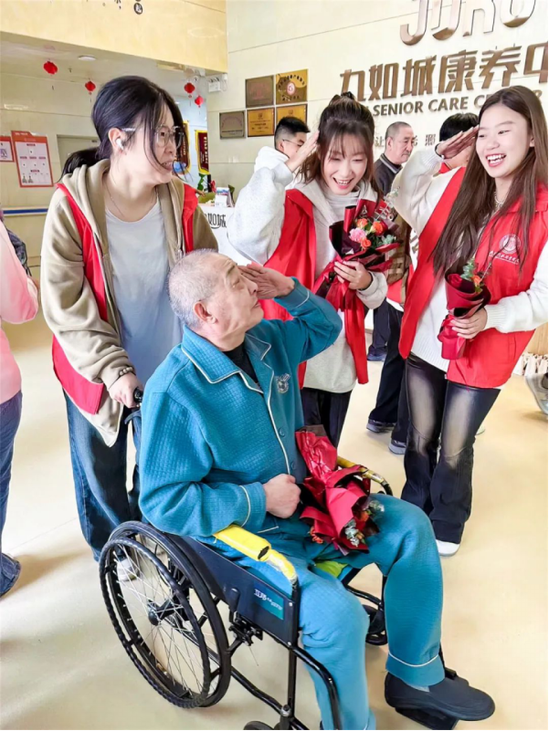 在九如城韩院长的带领下,智慧健康养老服务与管理专业的学生们耐心询问老人们的身体状况,陪他们聊天,协助他们上下楼参加活动。大家载歌载舞,与老人们合唱经典曲目,并为他们送上鲜花和节日祝福,不仅丰富了他们的日常生活,也为老年人带来了温暖的陪伴。