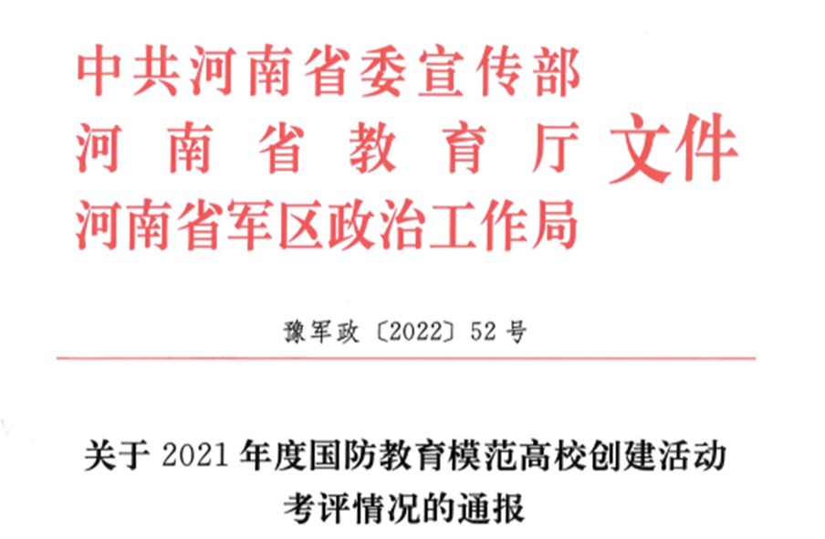 近日,中共河南省委宣传部、河南省教育厅、河南省军区政治工作局联合发布《关于2021年度国防教育模范高校创建活动考评情况的通报》文件,授予海立方娱乐城 2021年“河南省国防教育模范高校创建考评达标单位”荣誉称号。近...