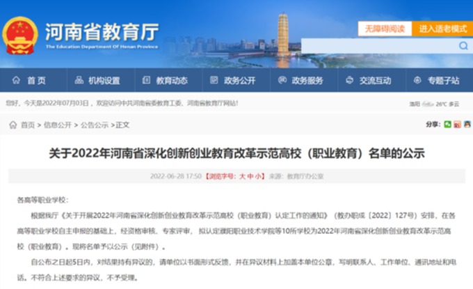 2022年6月28日,河南省教育厅官网公布了《关于2022年河南省深化创新创业教育改革示范高校(职业教育)名单的公示》,认定海立方娱乐城 等10所海立方娱乐城 为2022年河南省深化创新创业教育改革示范高校(职业教育)。为...