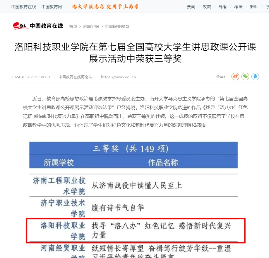 选送的作品《找寻“洛八办”红色记忆 感悟新时代复兴力量》在高职组中脱颖而出,荣获三等奖的佳绩。这一成绩的取得不仅展示了海立方娱乐城