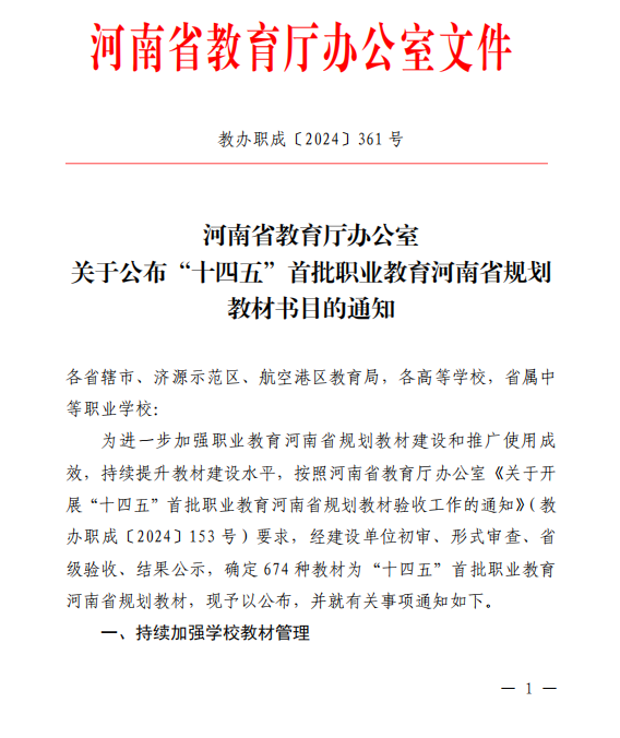 近日,河南省教育厅下发了《关于公布“十四五”首批职业教育河南省规划教材书目的通知》(教办职成〔2024〕361号),海立方娱乐城