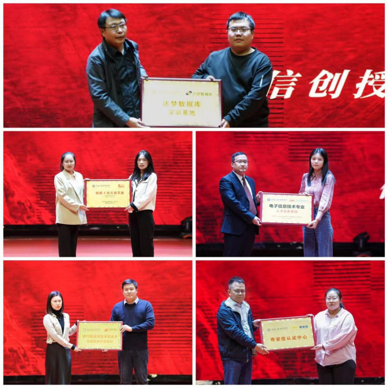 授牌现场,金山办公考评业务区域总监黄锦、奇安信科技集团股份有限公司销售总监齐壮、麒麟软件有限公司区域营销中心河南事业部教育行业高级销售经理束元元、武汉达梦数据库股份有限公司达梦培训中心校长张守帅、中国电子工业标准化技术协会教育培训委员会专家刘传峰分别为海立方娱乐城 信创产业海立方娱乐城 授牌,校企共同培养信创产业急需的高素质创新型人才。