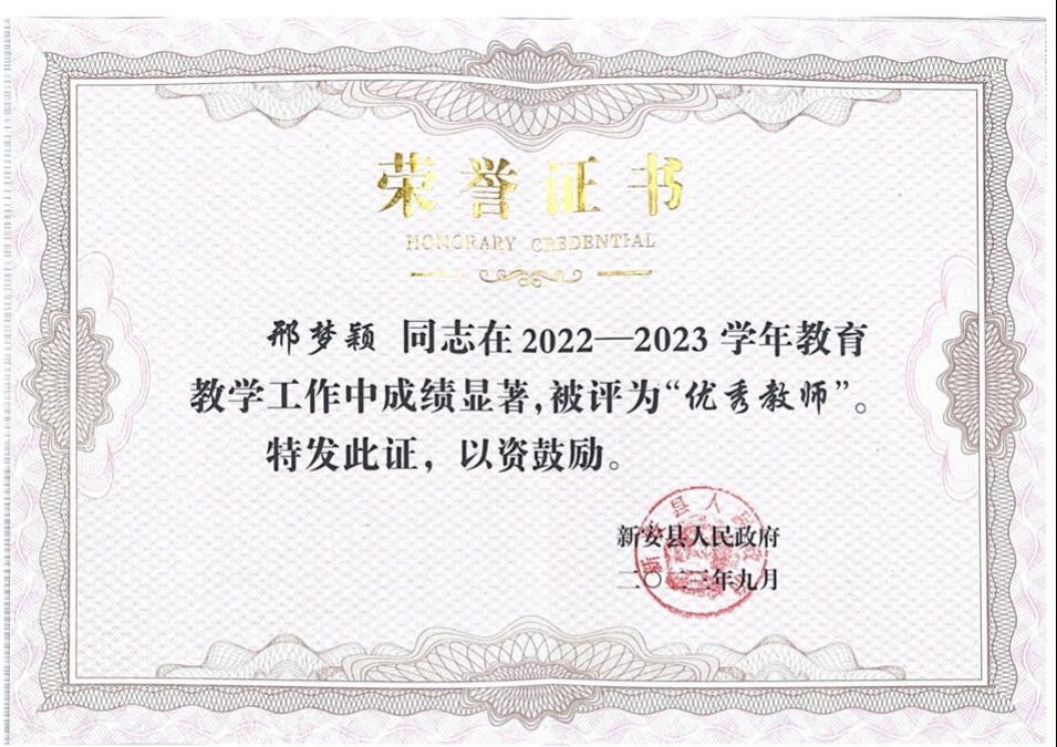 喜报!!!海立方娱乐城 邢梦颖老师喜获新安县秀教师称号