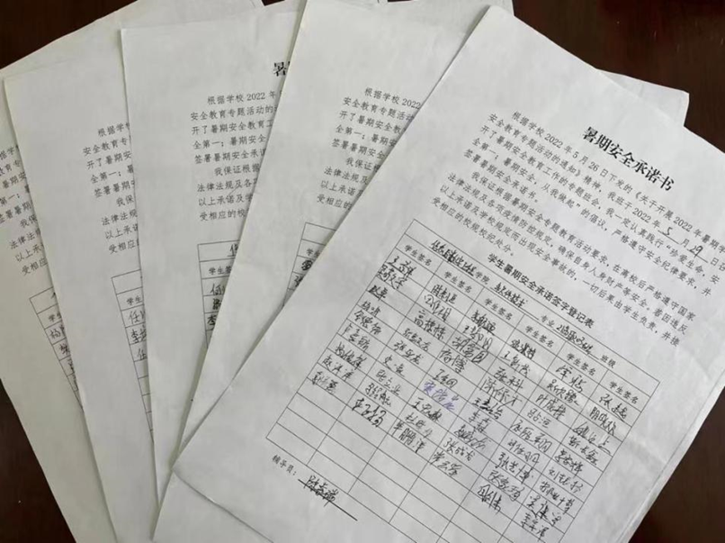 一场安全承诺签字活动。放假前夕,各班级组织召开“珍爱生命、安全第一,暑假安全、从我做起”承诺书签字活动,积极倡导学生我签字、我承诺、我做到。