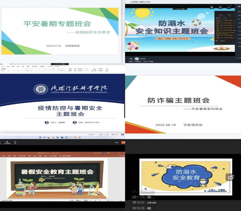 一个安全主题班会。暑期期间,辅导员每周日组织召开各班级安全主题班会,主要内容包括心理健康教育、疫情防控、防网络诈骗、防非法校园贷、防交通事故、防溺水等。