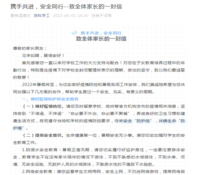 一封致家长告知书。给学生家长一封信,告知家长可能存在的安全风险,加以防范。家校携手合作,重视学生安全教育与监护,共铸生命“防护墙”。