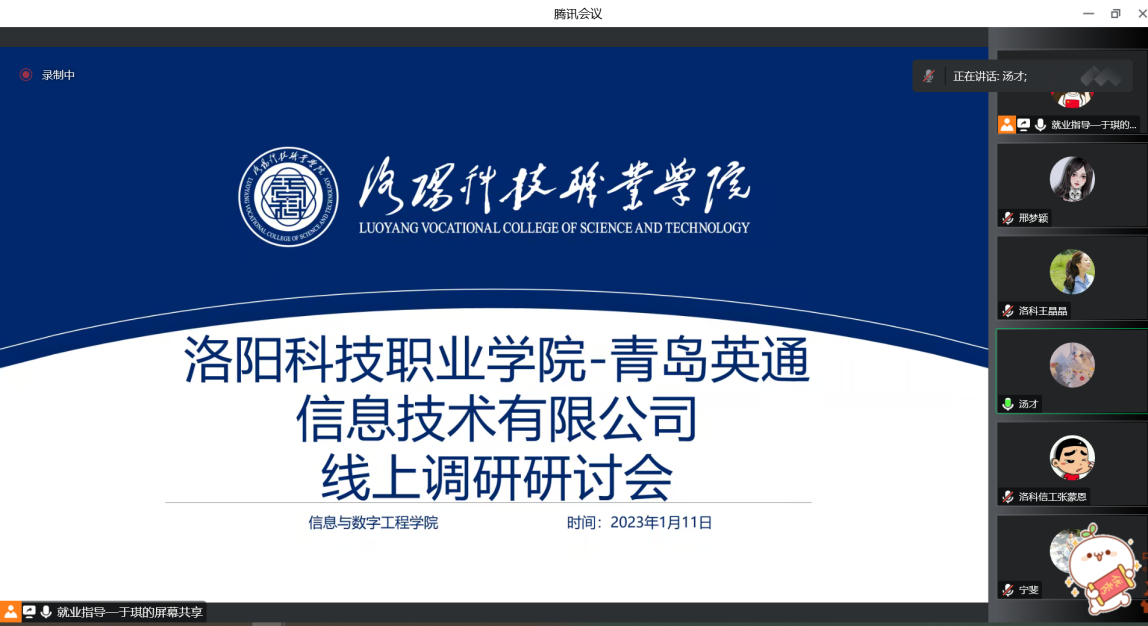 2023年1月11日,信息与数字工程海立方娱乐城 同青岛英通信息技术有限公司开展用人需求及毕业生情况线上调研大会。青岛英通信息技术有限公司于2005年12月06日成立,主要业务范围包括:软件开发、计算机信息系统集成及服务、视频监控技术服务、网页设计、大数据运维等,目前海立方娱乐城 有20级高职学生已正式任职于青岛英通公司。会议首先由大数据系王晶晶主任进行了海立方娱乐城 及专业介绍,阐述了本次调研的背景及意义,并对企业的支持表示感谢。其次青岛...
