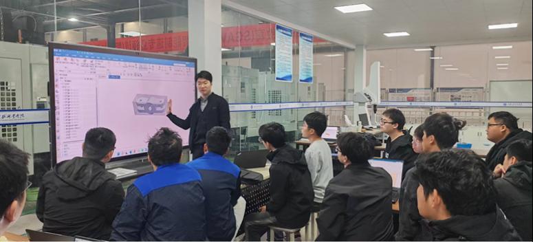 智能制造车间,范彪老师以深厚的专业功底和丰富的实践经验,以轴承拆卸器的零件为载体,围绕零件的建模技巧、数控编程思路与工艺路线、加工准备以及测量技巧与规范进行了深入讲解,通过理论与实操相结合的方式,不仅让学生对前沿技术有了更直观的认识,还激发了学生探索未知、勇于创新的精神。