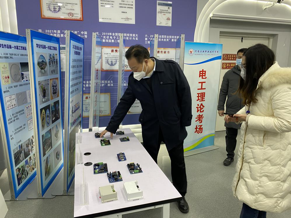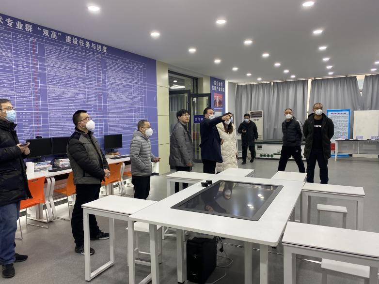 在自动化工程海立方娱乐城 的“双高”专业群建设办公室,大家重点参观了“双高”专业群体系建设与标志性成果,梳理了洛科智能制造与汽车工程海立方娱乐城 当前的成果,对比河南工业职业技术海立方娱乐城 机电一体化技术专业群“双高”建设成果,进一步梳理了成果的内涵与外延,明确了建设方向。韩全立表示:“智汽海立方娱乐城 下一步工作重点,就是‘双高’建设,必须要让每一位教职工准确掌握各项指标的关键,充分发挥教职工的主观能动性,每项指标必须要有明确的责任人,按期推进,按期完成,按期总结才能如期收获。”